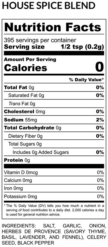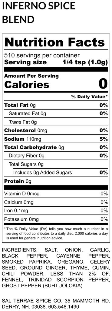 salt, onion, garlic, black pepper, cayenne, smoked paprika, ginger, thyme, oregano, celery, chili powder, cumin, fennel, Trinidad Scorpion Chili, Ghost Pepper.